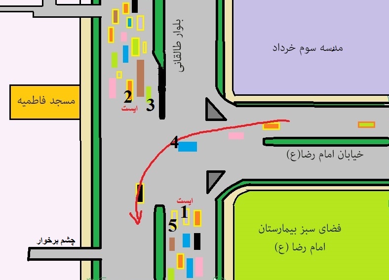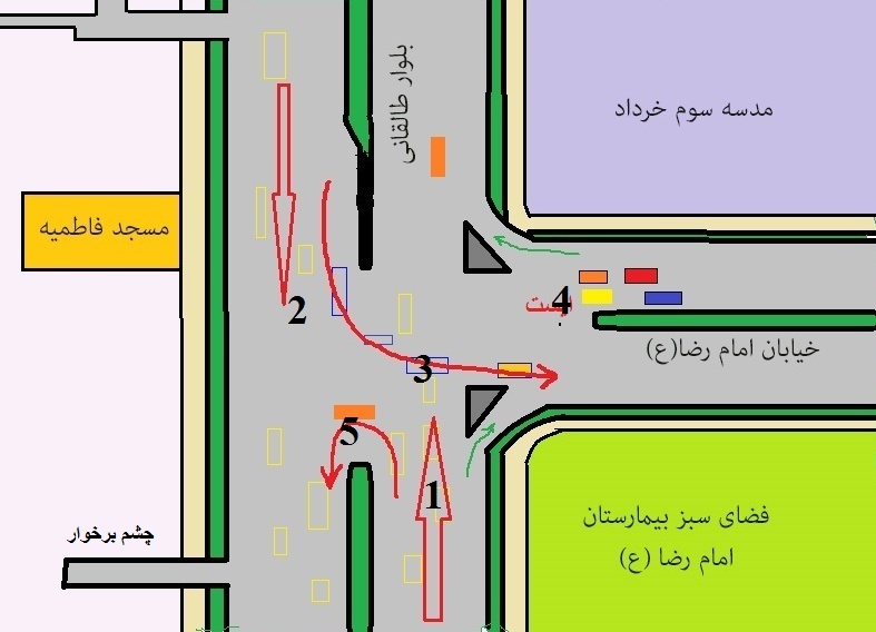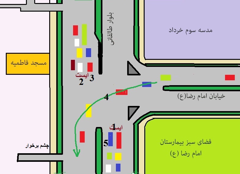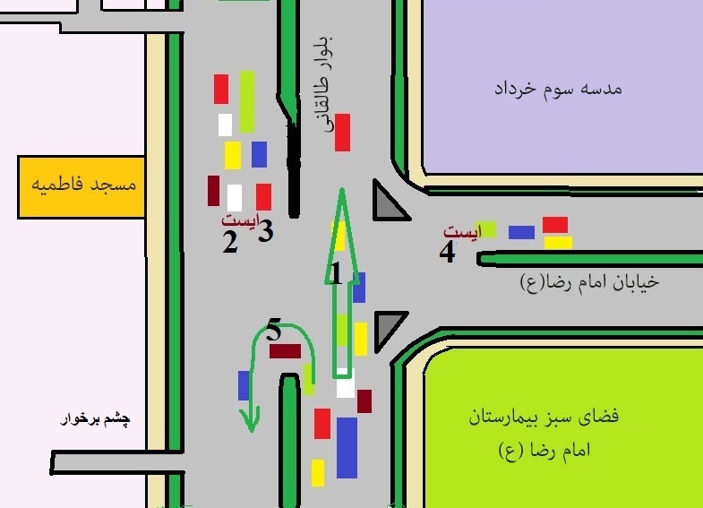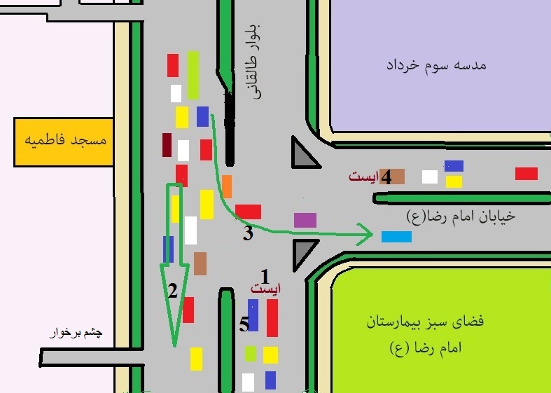 مشاهده کنید چار مسیر همزمان با هم سبز است .. مشاهده کنید مسیر 3 برای مسیر شلوغ1 و مسیر 5 برای مسیر شلوغ 2 ایجاد مزاحمت می کند ..
