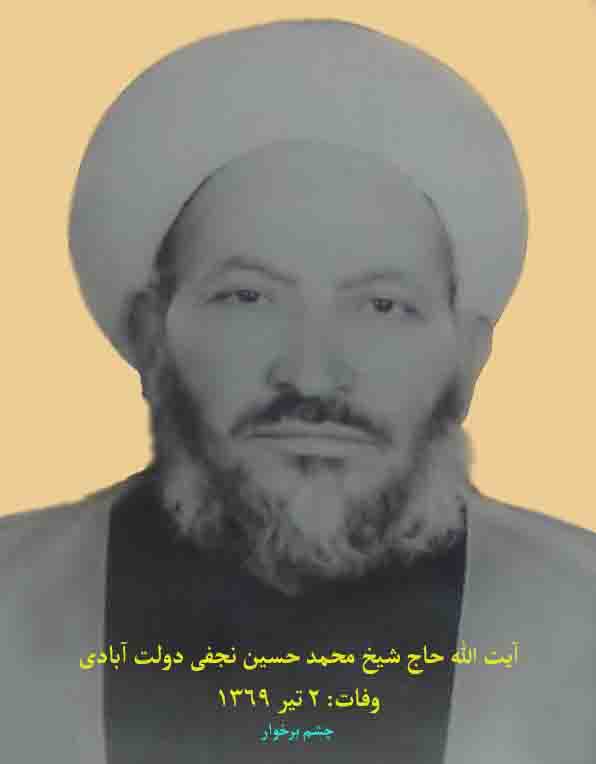 مرحوم آیت الله حاج شیخ محمد حسین نجفی دولت آبادی (ره) سال 1298 هجری شمسی در دولت آباد برخوار اصفهان در یک خانواده متدین کشاورز به دنیا آمد وتا سن 18 سالگی دروس متداول آن زمان را نزد عمویش ملاحسن فرا گرفت وسپس به قصد نجف اشرف بهمراه پدرش مرحوم غلامحسین ومادرش راهی قم شد که در شهر مقدس قم پدر را از دست داد ولی عشق عتبات عالیات مقدسه او را واداشت به همراه مادرش راهی عراق شوند.